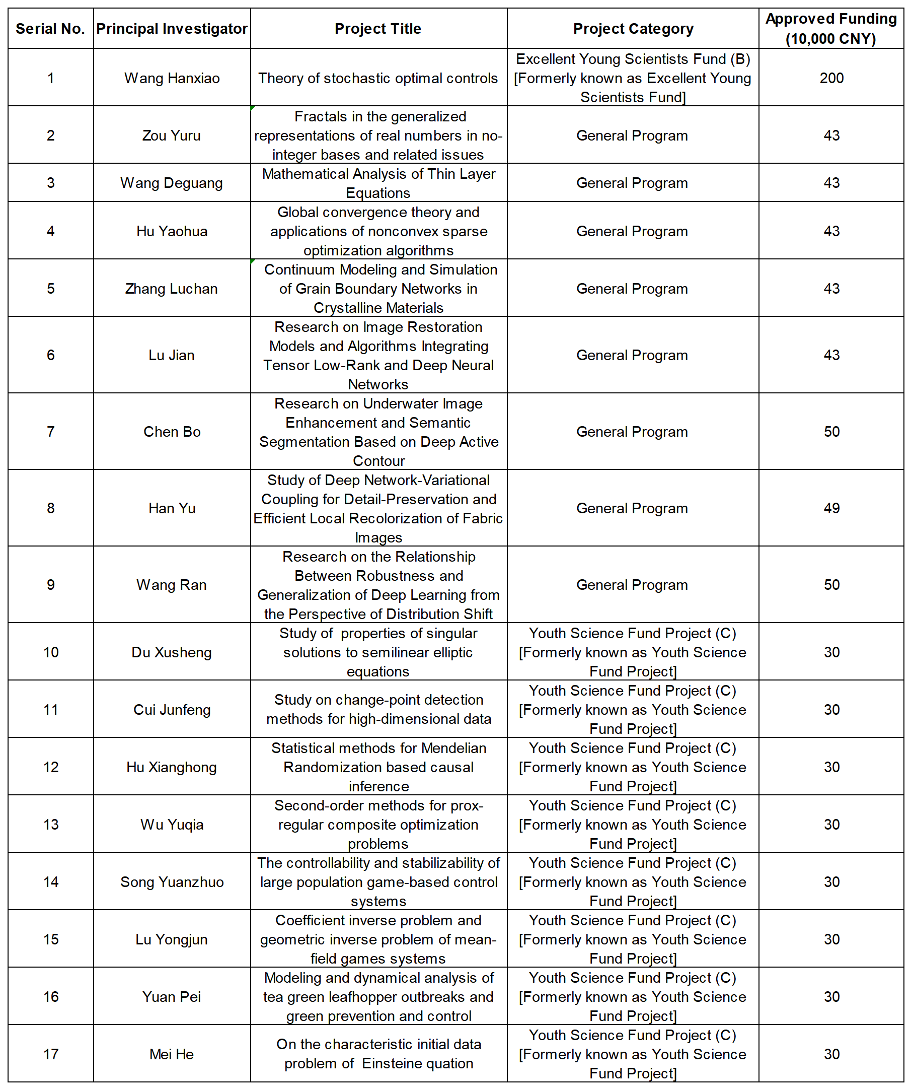 Recently, the National Natural Science Foundation of China (NSFC) announced the first batch of funding results for the year 2025. The School of Mathematics at Shenzhen University achieved a historic breakthrough in its application efforts. According to statistics, the School submitted 56 projects in the first batch of centralized applications this year, with 17 projects approved (exceeding the previous historical high of 11 projects set in 2017). The approval rate reached 30.36%, with total funding amounting to 8.04 million yuan. The approved projects include: 1 Excellent Young Scientist Fund (Category B), 8 General Program projects, and 8 Youth Science Fund (Category C) projects. Compared with previous years, the School has demonstrated sustained and steady growth in NSFC project applications: the average annual number of approved projects over the past three years was 9. In 2025, the number of approved projects surged to 17, surpassing the average of recent years and setting a new historical record. Notably, the approval rate for 2025 rose to 30.36%, a significant increase from 12.96% in 2024. This achievement reflects the School’s continuous optimization in project quality control and application organization. Moreover, the School has secured the National Natural Science Foundation Youth Program (Category B) for four consecutive years, highlighting its strong potential in supporting young scientific researchers and sustainable development.