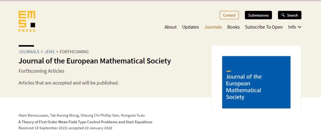 Recently, an academic paper titled “A Theory of First Order Mean Field Type Control Problems and their Equations,” co-authored by Associate Professor Wong Tak Kwong from the Differential Equations and Applications Research Team at the School of Mathematical Sciences, Shenzhen University, along with Professor Alain Bensoussan from the University of Texas at Dallas, Professor Ren Shangzhi from The Chinese University of Hong Kong, and Assistant Professor Yuan Hongwei from the University of Macau, has been accepted for publication in the internationally renowned academic journal “Journal of the European Mathematical Society.”