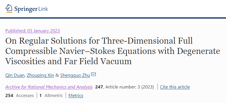 目前,国际知名学术期刊“Archive for Rational Mechanics and Analysis ”(理性力学与分析)在线发表了深圳大学数学与统计学院副教授段琴与上海交通大学副教授朱圣国、香港中文大学蒙民伟数学教授辛周平合作的学术论文“On Regular Solutions for Three-Dimensional Full Compressible Navier-Stokes Equations with Degenerate Viscosities and Far Field Vacuum”。
