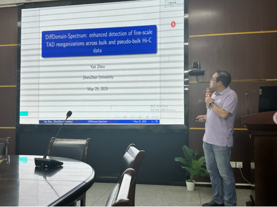 宣讲会后,周彦教授以《DiffDomain-Spectrum: Enhanced Detection of Subtle TAD Reorganizations Across Bulk and Pseudo-Bulk Hi-C Data》为题做了学术报告,报告聚焦染色质高级结构关键单位——拓扑关联域(TADs)的重组及其在疾病与发育中的重要作用。针对现有方法在检测细微TAD重组的局限,周彦教授重点介绍了其团队开发的创新方法DiffDomain-Spectrum。讲座结束后,与会师生与周彦教授进行了热烈的互动交流,就DiffDomain-Spectrum的应用前景、技术细节等问题进行了深入探讨。