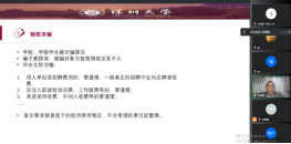 张国强老师对家长们一直以来对学院的支持和爱护表示感谢!向家长和同学们简要介绍了学校的发展情况和发展规划、学院发展历程和近年学科建设情况。张老师提到,学院形成本硕博完整培养体系,成立深圳大学数学研究所,在学科软科排名快速提高,数学学子就业形势好,升学深造氛围浓厚,毕业校友表现得到社会用人单位认可,学院的发展进入了新的发展阶段,将紧紧围绕学校发展目标,为建设世界一流创新型大学、一流数学学科而努力。随后,张老师紧扣毕业生主题从学业学习、就业深造、心理关爱、预防诈骗、国防征兵五个方面展开,和家长、同学们进行了交流。
