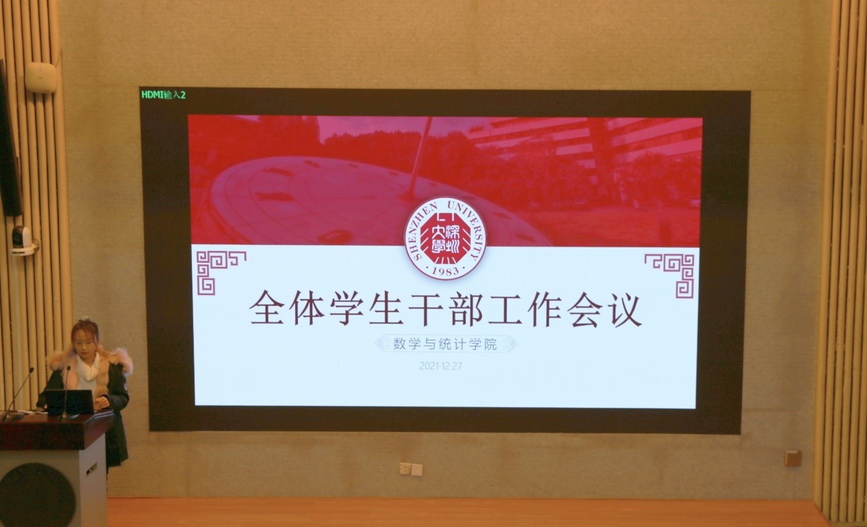 2021年12月28日中午,数学与统计学院在汇星楼三号报告厅召开期末全体学生干部会议,本次工作会议由辅导员肖晓君老师主讲,辅导员孙毅翀、钟晓姗及全体数院学生干部参加。