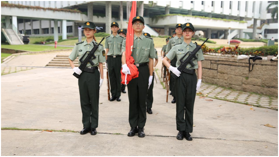 7:30升旗仪式拉开序幕。身姿挺拔、风姿飒爽的仪仗队步伐整齐,昂首挺胸擎着鲜艳的国旗来到升旗台前,同学们庄严肃穆注视国旗。随着校管乐队奏响国歌《义勇军进行曲》,国旗、深圳大学校旗此刻飘扬在深圳大学的上空。