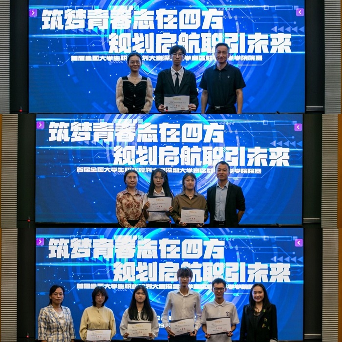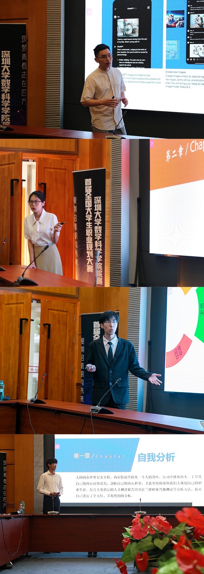 随着社会的快速发展和职业结构的不断变化,选择适合自己的职业道路变得越来越重要。为普及大学生职业生涯规划知识,提高大学生就业与实践能力,11月12日上午,首届全国大学生职业规划大赛深圳大学数学科学学院院赛在粤海校区国际会议厅成功举办。本次院赛,邀请到深圳市高层次专业人才、宝安区政协委员,深圳市宝安区西湾小学校长、海城小学主要负责人、蘅芳小学筹建主要负责人,2000届深大校友徐莹莹;北京师范大学香港浸会大学联合国际学院校园发展总监、创新中心处处长,2010届深大数学科学学院校友卢宏洲;安永中国数据智能咨询服务部经理,2013届深大管理学院校友周真一;GCDF&BCF职业生涯规划师、高校初级心理咨询师,深圳大学学生部就业指导中心龙菲老师担任赛事评委。