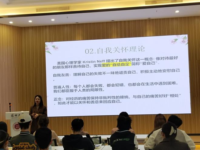 然后,王巧学姐向同学们讲解了美国心理学家Kristin Neff提出自我关怀理论,倡议与自己的“痛苦”好好相处,积极主动地安慰自己,实现爱的“自给自足”。学姐提到,我们可以从自我友善,普遍人性两个角度更加客观地认识自己,用正念地方法自我接纳,给予自己爱的力量,不要被困在自我指责的牢笼中。