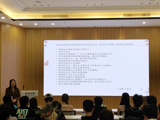 最后,学姐以皮特·沃克的话作结,鼓励同学们在生活中不断增强自我认同感和自我归属感,引导同学们在学习和生活中产生消极情绪时,积极主动地关怀自己,化解消极情绪,拥抱最真实的自己,不断培植自爱的力量。