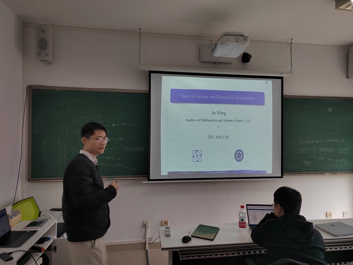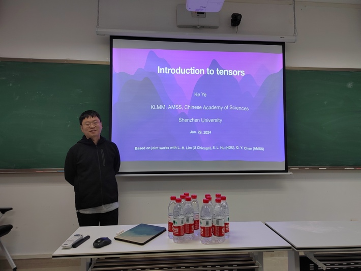 深圳大学数学科学学院于2024年1月29日至30日成功举办“应用代数几何” 短课程。本次活动邀请了中国科学院数学与系统科学研究院叶科副研究员、王杰副研究员、李子佳副研究员,深圳大学数学科学学院李楠副教授围绕“代数几何工具在张量计算、多项式优化、机构运动学以及计算机视觉等领域中的应用”进行了共16学时的专题课程与专题研讨。