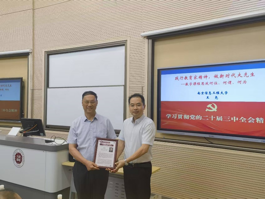 6月19日下午,数学科学学院荔园名师讲坛第十五期在粤海校区汇星楼一号教室开讲,讲座题目为:弘扬教育家精神,做新时代大先生——数学课程思政何位、何谓、何为。南京信息工程大学原党委副书记副校长(正校级)、二级教授、博士生导师王尧教授作为此次报告主讲人,为全院教师带来一场精彩的课程思政报告。讲座由学院院长主持,并为王尧教授颁授讲座纪念牌。