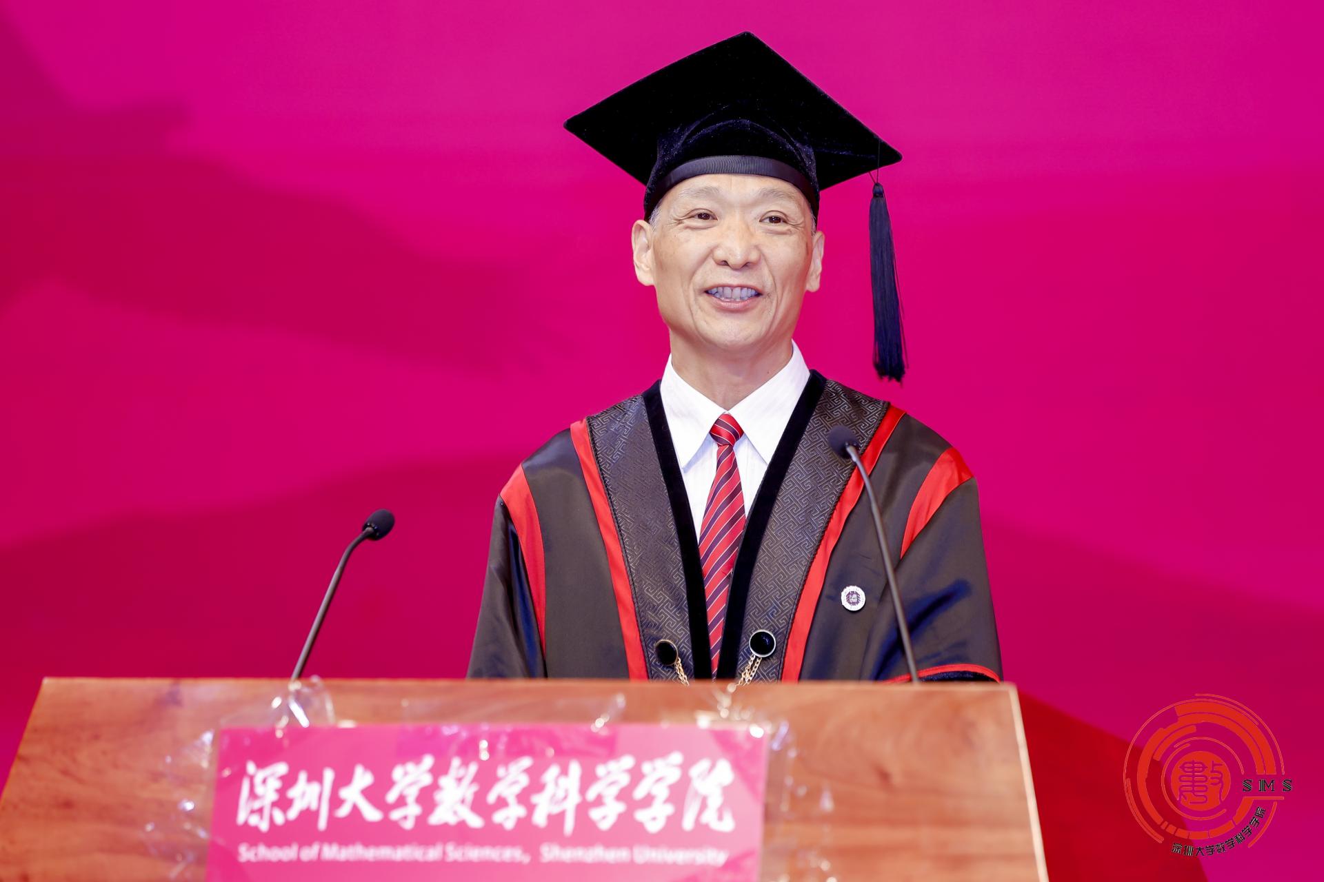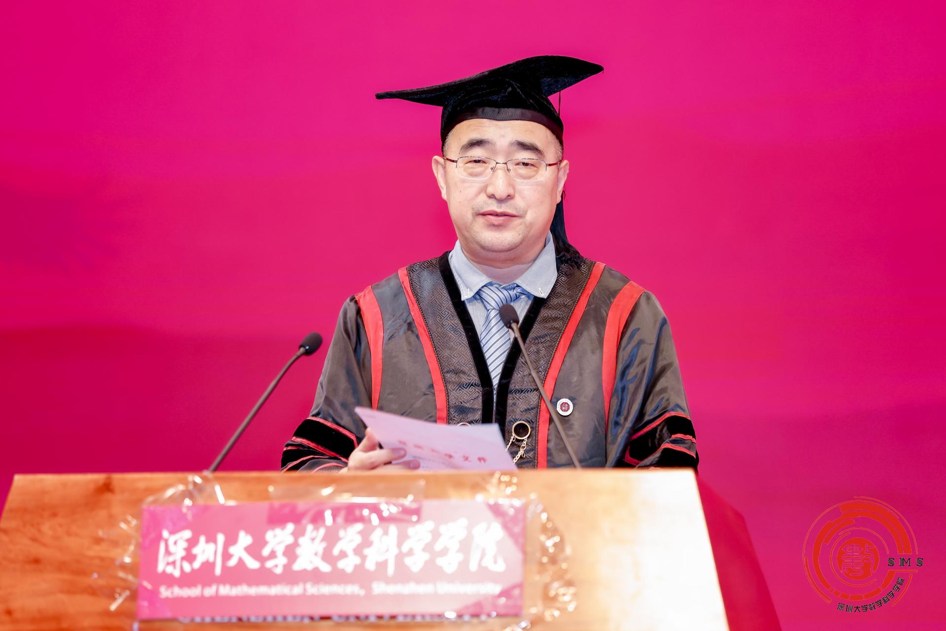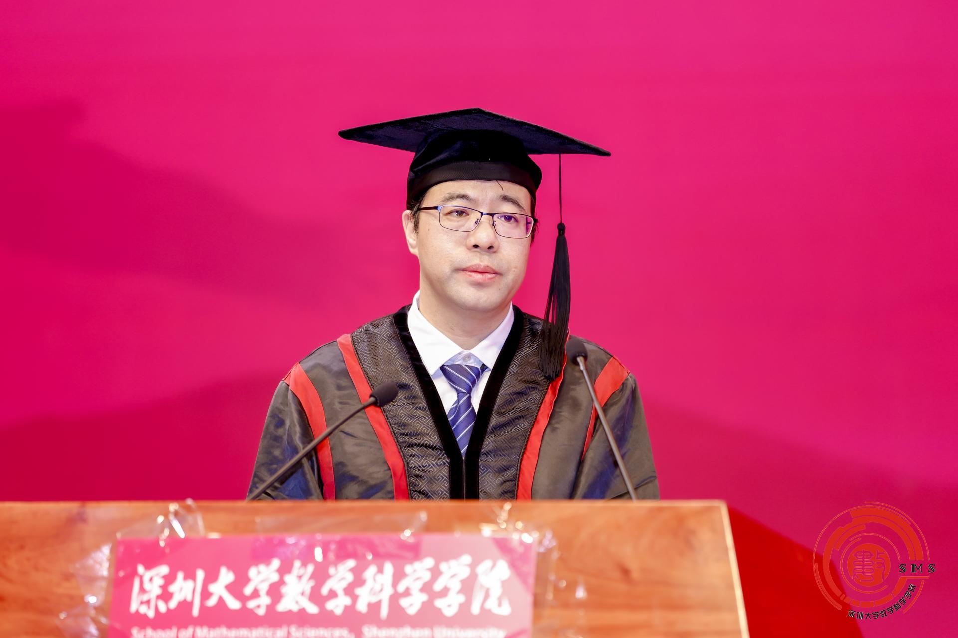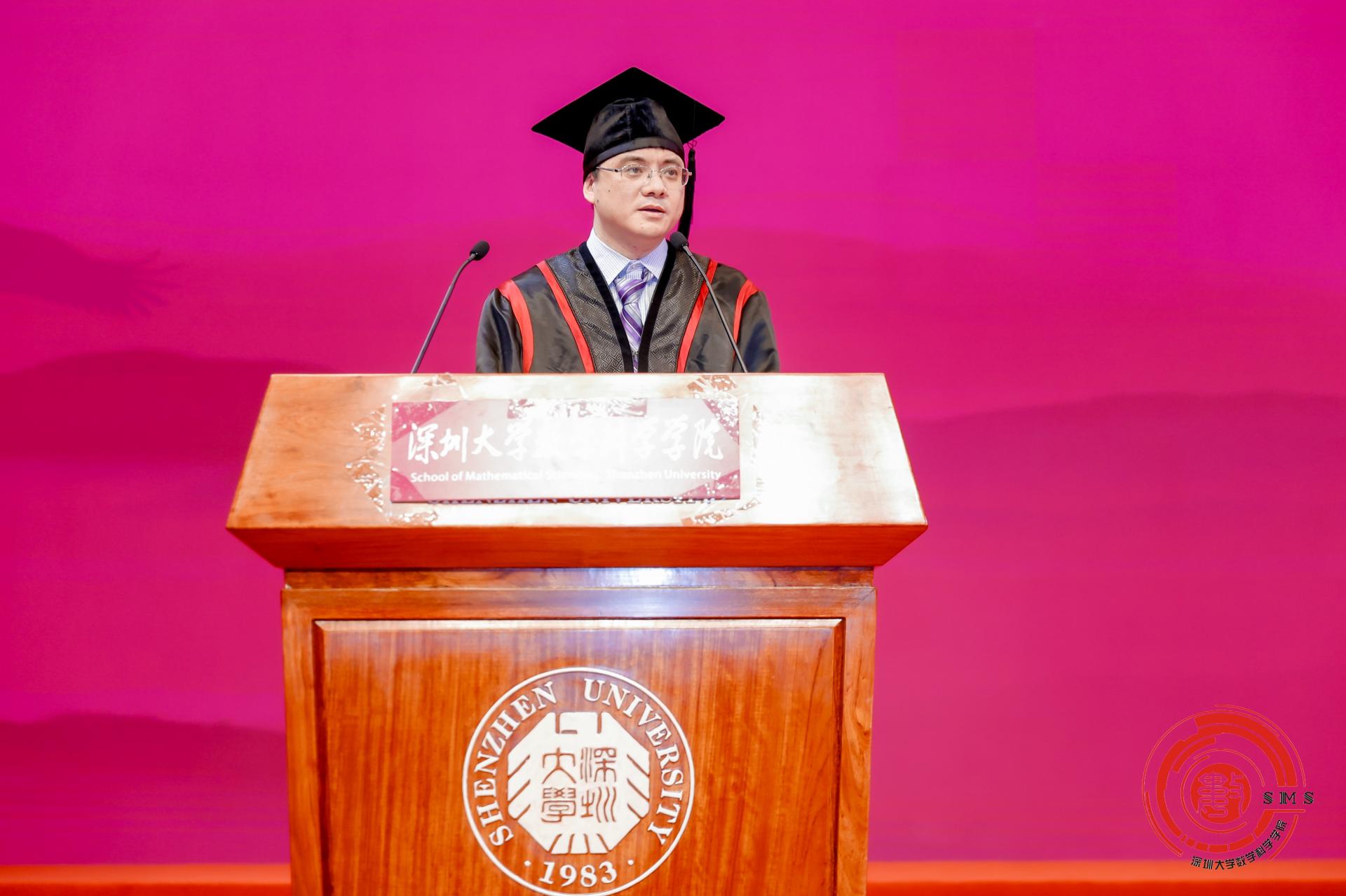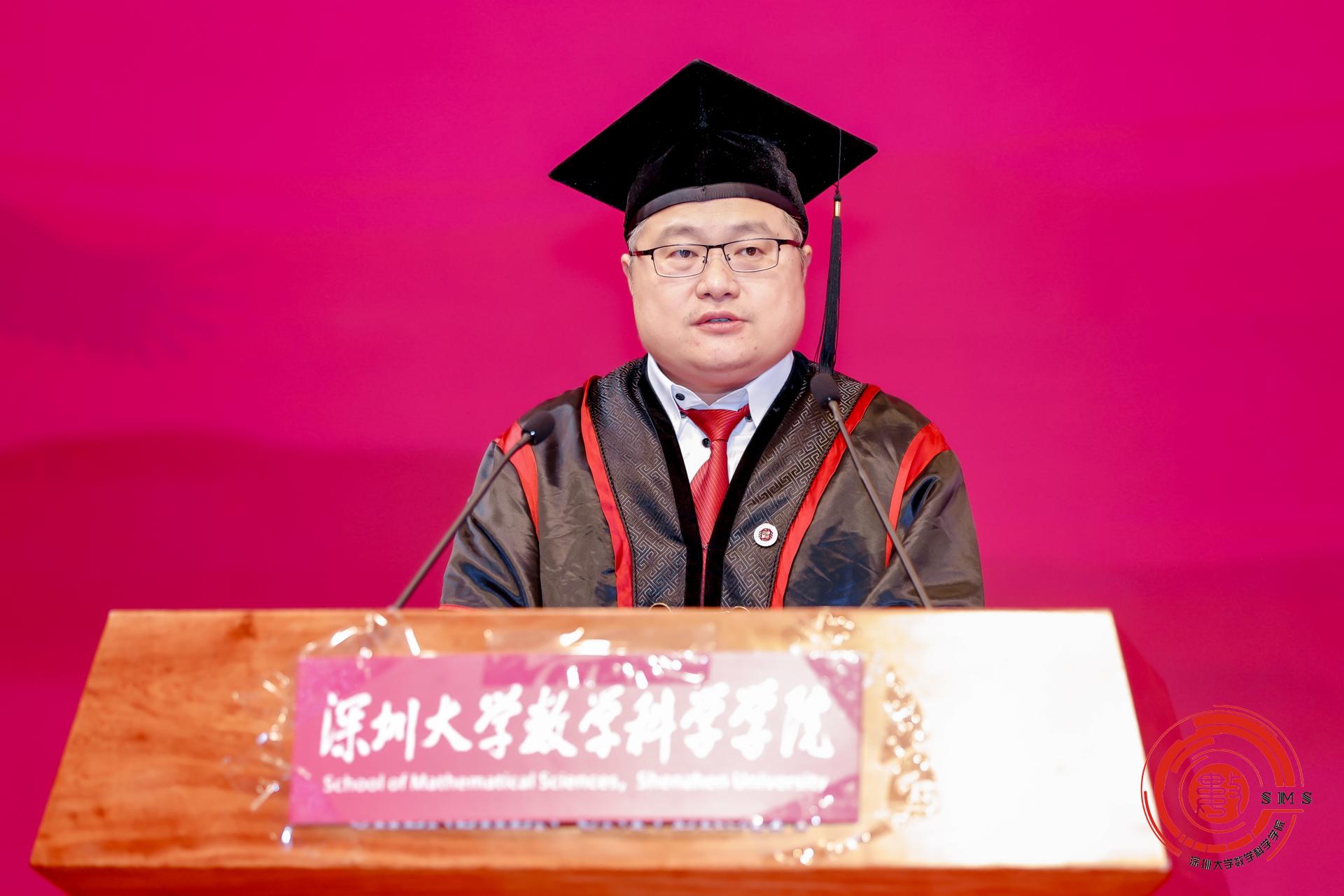 院长向全体毕业生致以祝贺,并以本年度华人数学界两大突破为引发表精彩致辞。王虹团队终结百年难题“三维挂谷猜想”,被陶哲轩誉为“重绘几何与调和分析边界”的突破;邓煜与合作者攻克希尔伯特第六问题,架起微观与宏观物理的数学桥梁。他寄语毕业生们要以三重坐标践行“敢为”精神——敢坐冷板凳、敢为天下先,以真诚与“佩罗树式”想象力守护学术松弛;敢坐浪潮巅、敢为变革者,用公理化思维与几何直觉在工具理性时代担当“生活算法师”;敢坐天地间、敢为众生谋,将用数学解码生命、优化社会、赋能文明视为最深的“数理浪漫”。最后勉励毕业生们如王虹笔下“刺破群山的细竹”,以柔韧穿透认知迷雾;如邓煜推导的硬球系统,在碰撞中跃向更高维度。在深大“敢为椅”上,以思考为支点,于“卷赢”与“躺平” 的二元叙事外,定义数学人生的第三解!