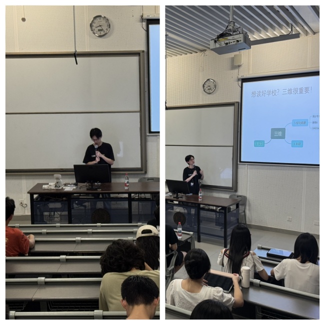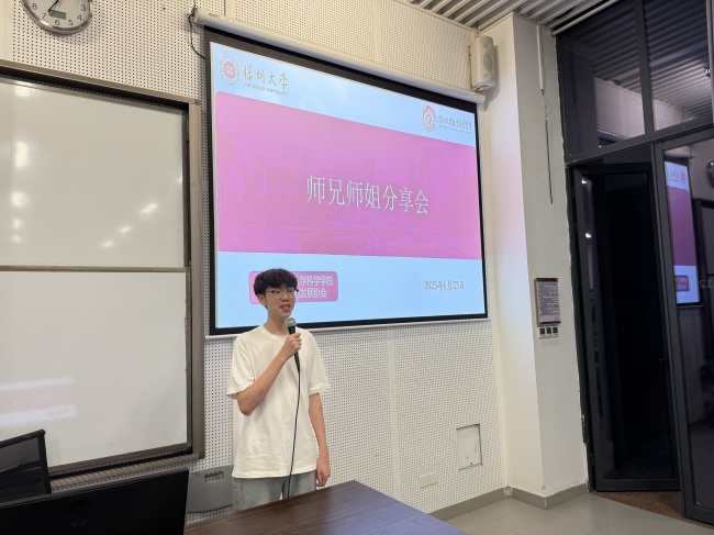 2025 年 6 月 23 日晚,深圳大学数学科学学院「师兄师姐有话说」升学专场在致理楼 B 座 112 教室举行。这场聚焦考研与留学双路径的分享会,特邀 21 级数学与应用数学(数理金融班)张霁超(曾获数学建模国赛广东省二等奖 ,全国大学生数学竞赛广东省一等奖等奖项,目前已被中山大学(珠海校区)数学专业录取,中山大学录取)与 21 级统计学专业邓思明(曾荣获深圳大学“学习之星”奖学金、“双创之星”奖学金、深圳大学优秀毕业生等奖项,目前获得牛津大学offer)两位学霸师兄,以硬核履历与实战攻略为学弟学妹破解升学密码。