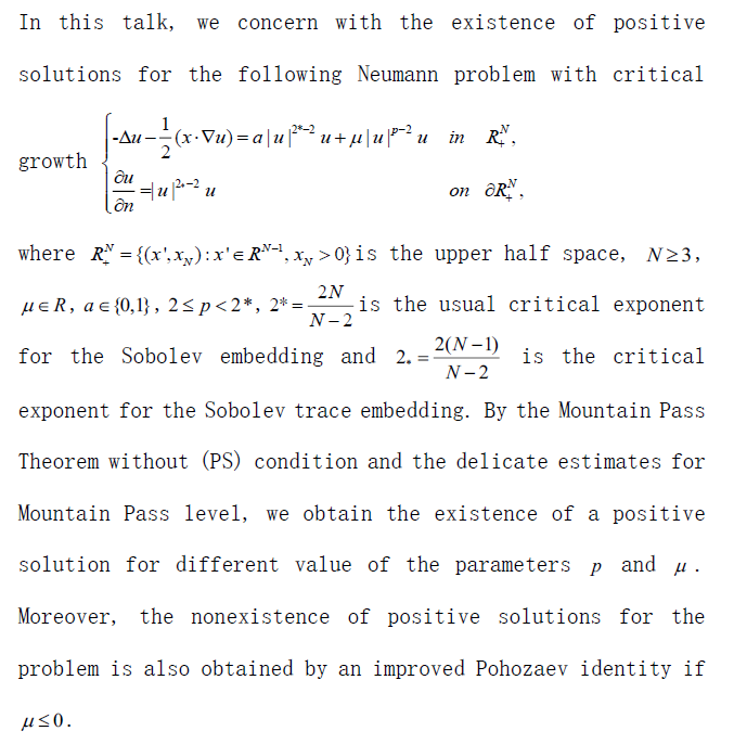 报告人简介:邓引斌,华中师范大学“博雅学者”特聘教授,博士生导师。主要从事非线性偏微分方程及其应用等领域的研究。多次主持国家自然科学基金重点项目和国家自然科学基金面上项目;多次应邀出访美国、澳大利亚、香港、瑞士等重要的国家和地区;发表论文近100多篇,其中100余篇被录入SCI国际重要检索系统。系列研究成果曾获教育部自然科学二等奖和湖北省自然科学一等奖。