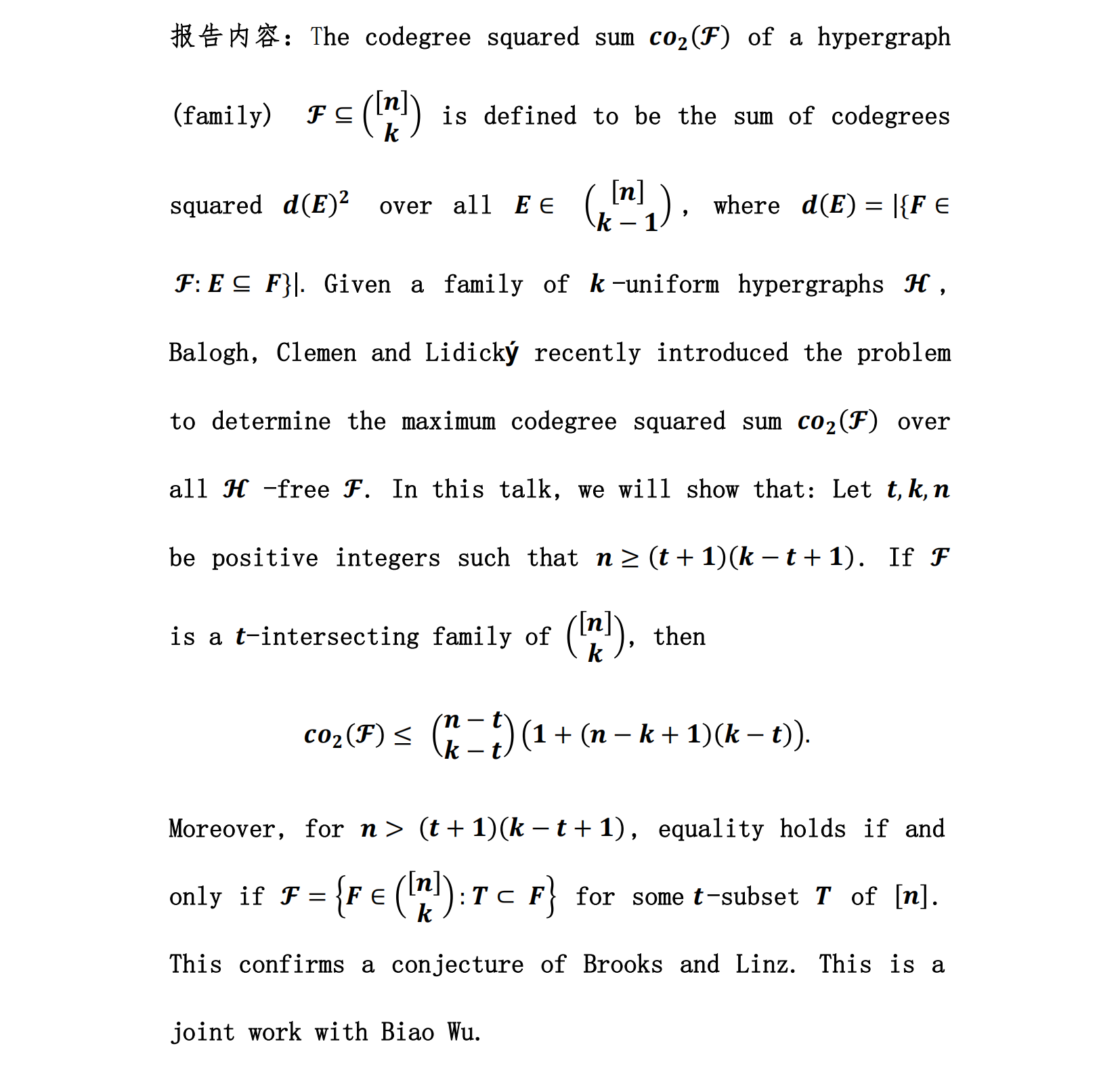 报告人简历:张华军,绍兴文理学院教授,浙江省高校中青年学科带头人,中国组合数学与图论专业委员会委员。主要从事组合极值理论研究,多篇论文发表在组合数学与图论领域的国际顶级期刊J. Combin.Theory Ser. A、J. Combin.Theory Ser. B、J.Graph Theory和SIAM J. Discrete Math.,主持或完成国家自然科学基金多项。