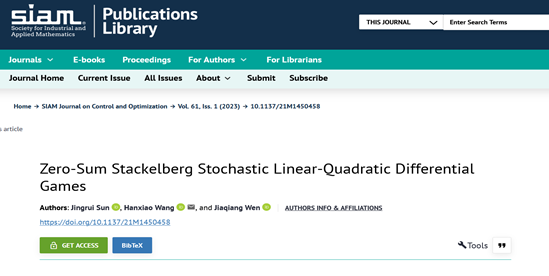 目前,国际知名学术期刊“SIAM Journal on Control and Optimization”(美国工业与应用数学会-控制与最优化杂志)在线发表了深圳大学数学与统计学院助理教授王寒霄与南方科技大学助理教授孙景瑞、温家强合作的学术论文“Zero-SumStackelberg Stochastic Linear-Quadratic Differential Games”。