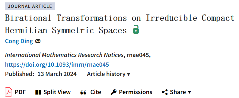近期,国际知名学术期刊“International Mathematics Research Notices”发表了深圳大学数学科学学院助理教授丁聪的学术论文“Birational Transformations on Irreducible Compact Hermitian Symmetric Spaces”。