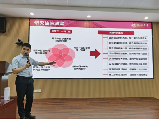 宣讲会上,胡耀华教授从学校历史、学校发展与人才培养成效展开,为同学们介绍了校园环境、学习资源等。随后,详尽地向同学们阐述了深圳大学数学科学学院的整体情况,包括专业设置、师资力量、培养特色、科研成果、平台建设等,并结合自己的课题方向和研究内容等详细介绍了深圳大学数学科学学院的人才培养体系及未来发展方向。