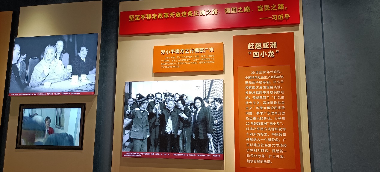 展览的第二部分为“增创优势,砥砺前行”(1992—2012年)。改革开放的航程绝非一帆风顺。每当历史紧要关头,广东都会得到党中央的亲切关怀和大力支持。1992年春,邓小平视察广东等地,并发表著名的南方谈话;2000年春,江泽民在广东提出“三个代表”重要思想;2003年春,胡锦涛在广东提出科学发展的思想。党的理论创新与广东实践息息相关,引领广东改革开放增创优势,率先转入科学发展轨道。改革开放的这一阶段,广东以建立社会主义市场经济体制为目标,掀起新一轮深化改革、扩大开放、加快发展的热潮。