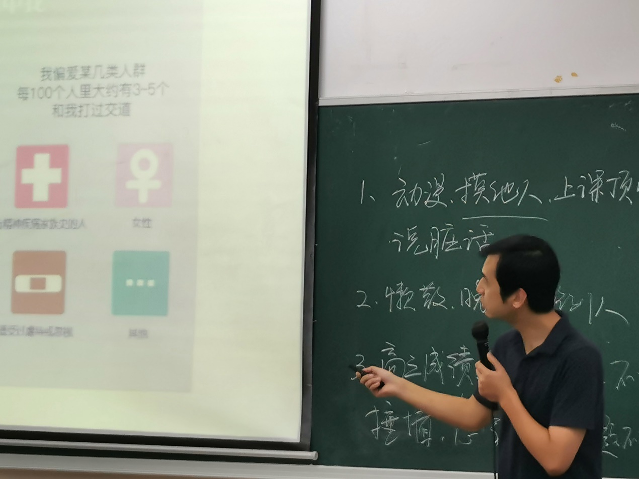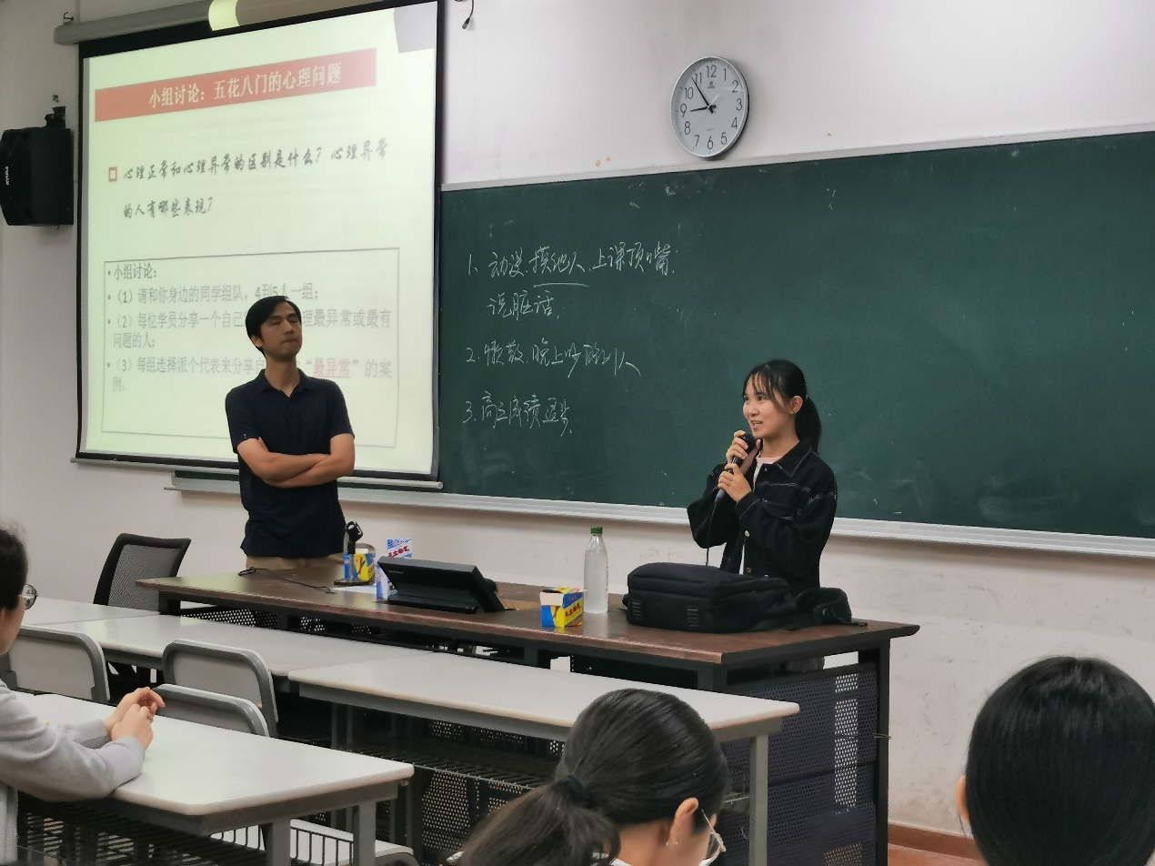 第一个讲座于文科楼h3-201的多媒体教室进行,主讲老师为我校应用心理学研究与咨询中心的老师刘玎。参与讲座的同学约50人。 本次讲座的主题是“常见心理问题的识别与调整”。讲座开始,刘玎老师让大家分小组讨论生活中遇到到有心理问题的人,同学们积极参与讨论,并轮流上台分享讨论成果。