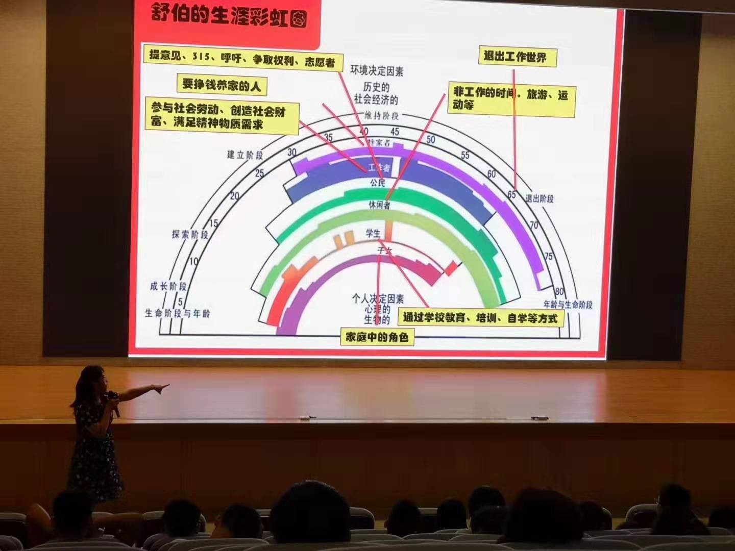 接着,韩芳丹老师用舒伯的生涯彩虹图讲解了在人在人生各个阶段所担任的不同角色,接着老师解释了生涯、生涯规划的定义与意义,并用一则招聘信息来诠释大学生需要全面发展自己的专业能力、技能与才干,并提议每年给自己写一份简历,来了解自己这一年是否有提升。