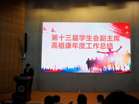 学生会的年度工作总结紧承着团委年度工作总结进行,由学生会副主席高祖康汇报。高祖康同学首先向大家介绍了我院团委及其下属学生会的主要架构模式。接着从团学组织建设、校园文化活动。学生权益三个方面出发,回顾了过去一年学生会所做的工作及取得的成绩。同时也期盼着团学新骨干能带领数院团学走向新高。
