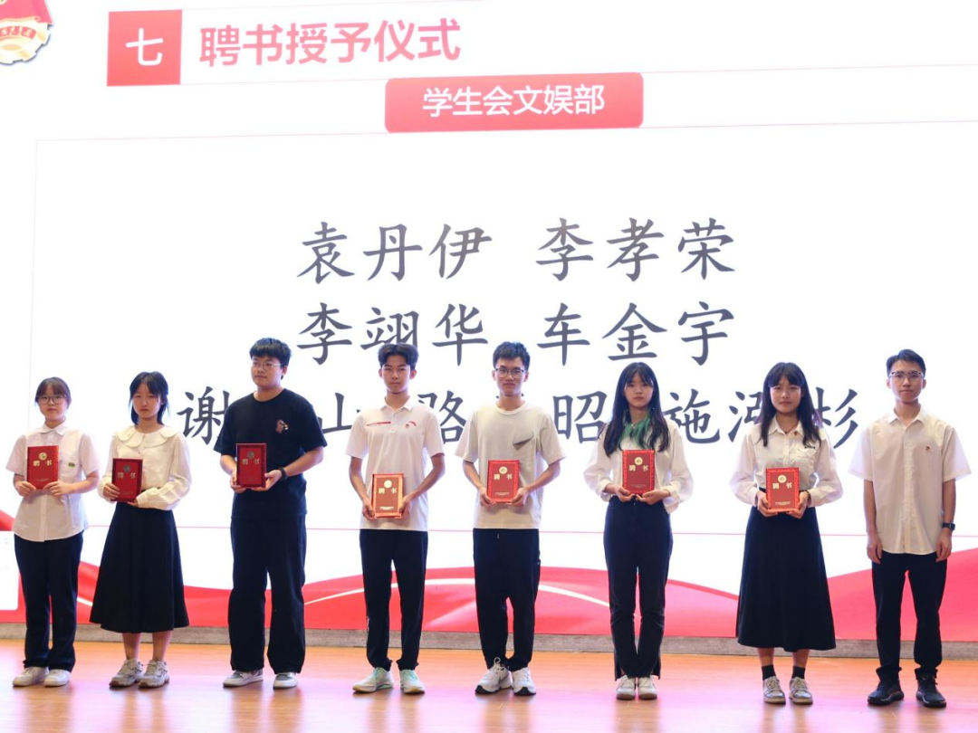 之后,学生会主席田野为学生会各部门成员颁发聘书并合影留念。