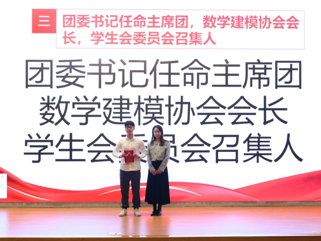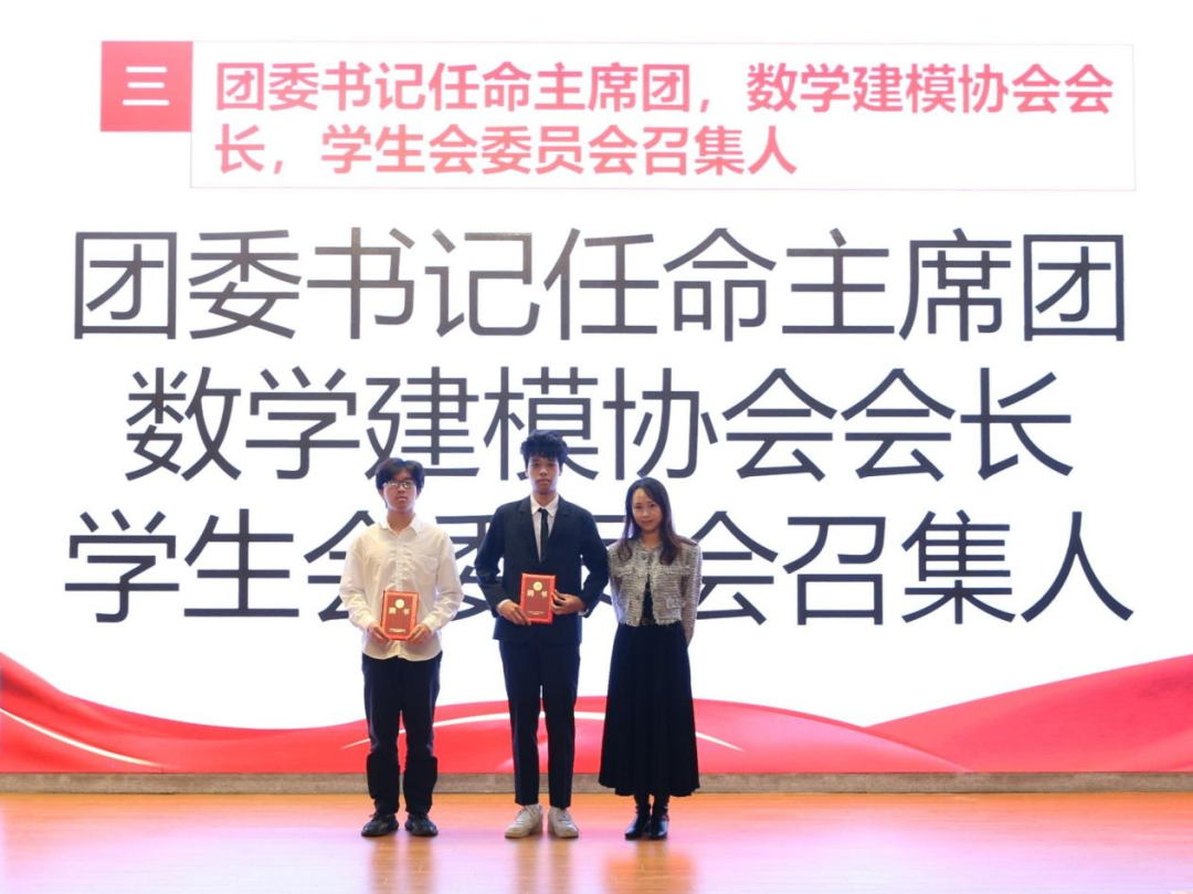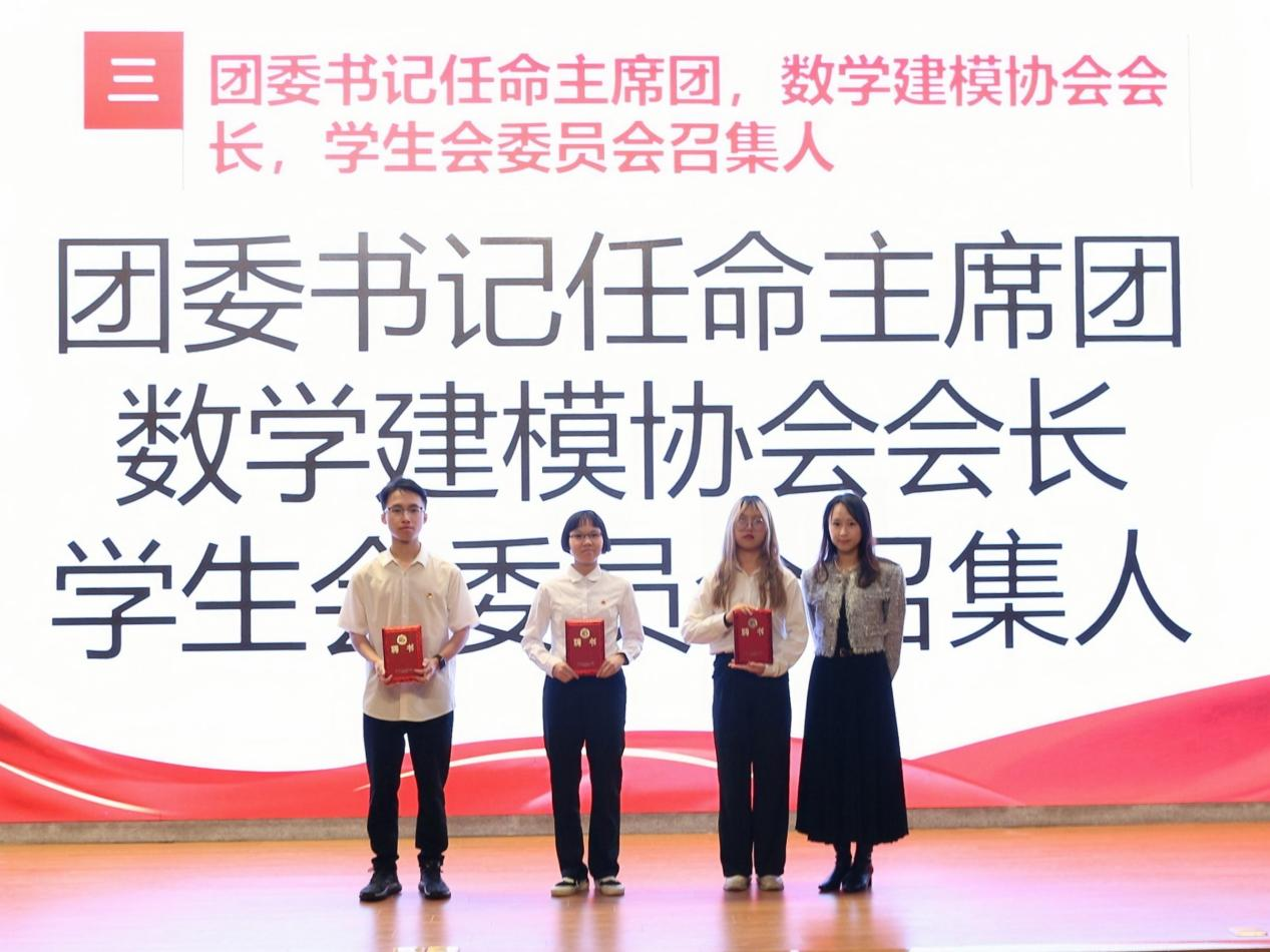 致辞结束后,团委书记肖晓君老师任命主席团、数学建模协会会长和学生会委员会召集人,为他们颁发聘书并合影留念。