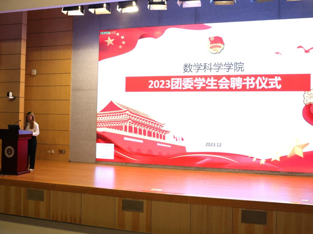 为了总结上一年度数学科学学院团委学生会的工作情况,迎接新鲜血液,2023年12月3日早上8:30,数学科学学院在汇星楼一号报告厅召开了2023数学科学学院团委学生会换届大会,出席本次大会的老师有团委书记肖晓君,团委副书记、学生会指导老师孙毅翀,以及全体团委学生会干部成员。