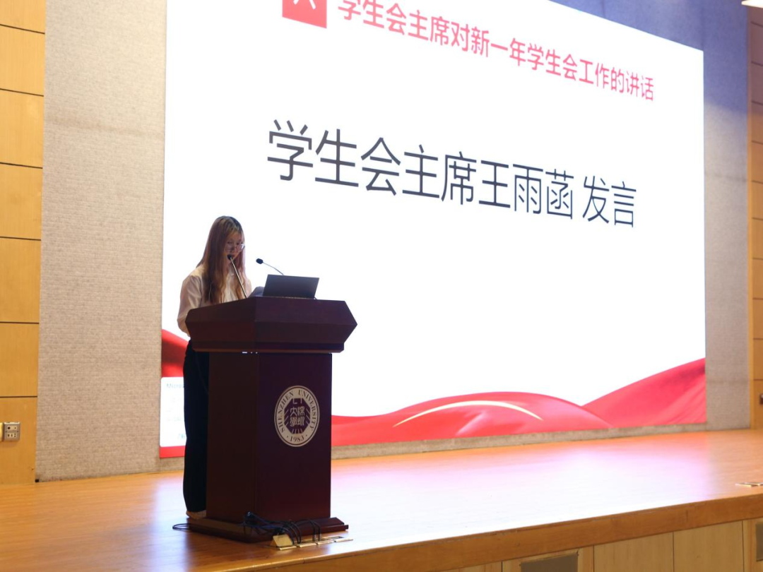 随后,由学生会主席王雨菡做新一年学生会工作讲话。讲话中,她总结了学生会的贡献与成就,感谢大家的辛苦付出。同时,她也总结出了学生会工作的不足与短处,希望学生会的同学们可以努力克服困难,解决问题,大家齐心协力创造数院更美好的明天。