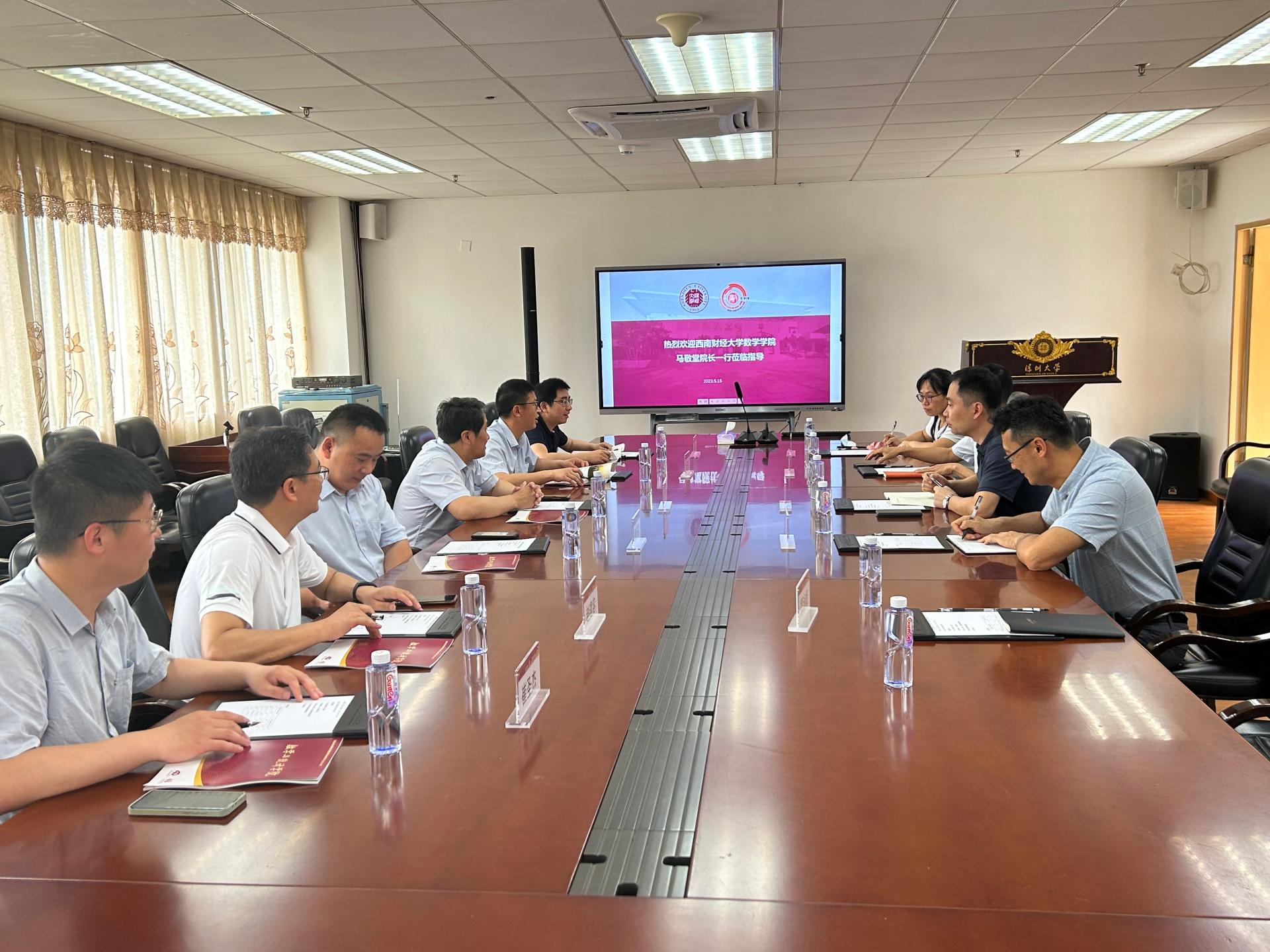 5月15日上午,西南财经大学数学学院院长马敬堂、副书记郭开强、数学研究所所长孟开文、数理金融研究中心主任赵建容、数学研究所副所长王永富、辅导员崔圣杰一行人到访我院,我院院长、副书记张国强、副院长赵毅、办公室主任韩芳丹、行政秘书郑泳姬参加了此次交流会,双方就学科建设、人才培养、高层次人才引进等主题展开了深入交流。