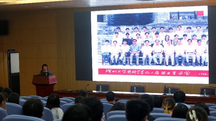 首先,陈女士从我们为什么要上大学出发,和大家分享了大学校园中经历的几件影响一生的趣事。陈女士认为大学是进入社会的纽带,不仅是学习专业知识的学府,还是锻炼我们社会实践能力的港湾,是为进入社会、独立做选择做准备。陈女士谈到,在校运动会中,与专业队员同台竞技,每天挑战跑步极限,在长跑中勇夺亚军;一群没有舞蹈基础的同学共同决定参加学校艺术节,自己请专业老师训练,取得了好成绩,一向节俭的老师得知后欣喜若狂,决定慷慨解囊为全班同学准备了一顿丰盛的大排档晚餐;毕业时遇上不包分配,直接进入就业市场;参加实验超市勤工俭学工作……这些充满了酸甜苦辣的校园生活,不仅锻炼了意志,磨炼了挑战自我的勇气魄力,还收获了美好的友谊,留下了美好的回忆。