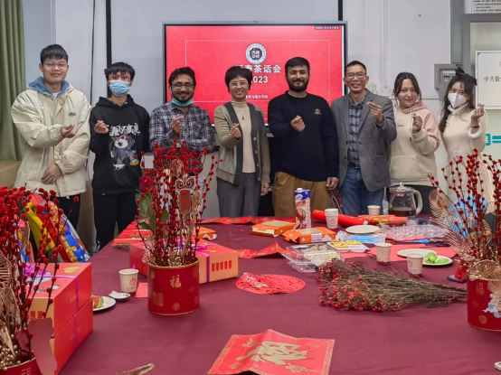 1月18日下午,院党委王瑜书记、张国强副书记、辅导员肖晓君老师、研究生秘书刘欢老师在汇星楼501活动室慰问我院寒假留校学生,向同学们致以美好的新春祝福。师生齐聚一堂,两位2022级外籍博士生第一次在中国过年,大家一起插花、剪纸、贴春联、品尝下午茶点,共度温馨、欢乐、喜庆、祥和的时光。