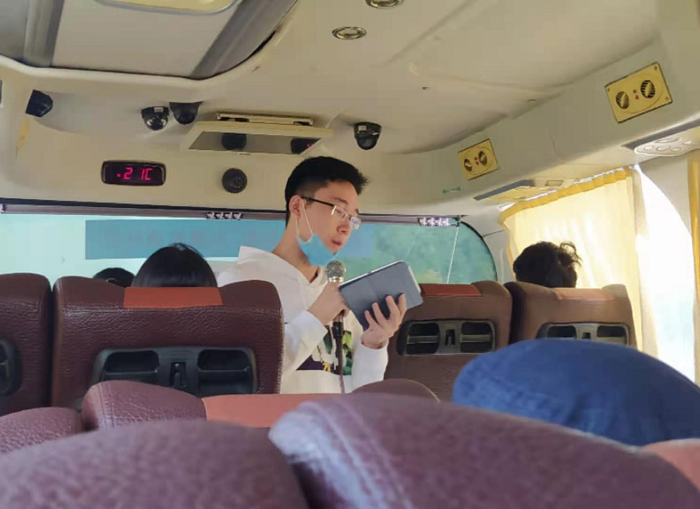 微党课学习部分,全体成员在前往博物馆的路上进行学习,主讲人是第二党支部党员冯王铖同学和第一党支部党员何诗妍同学。冯王铖同学的微党课内容主要是为同学们阐述民法典的制定和颁布历程、民法典的颁布将给我们生活中带来什么样的影响和为实施好民法典需要做的工作;何诗妍同学的微党课内容主要是为同学们讲述了什么是红色基因、不同的时代有什么样的红色精神和如何讲好中国故事。