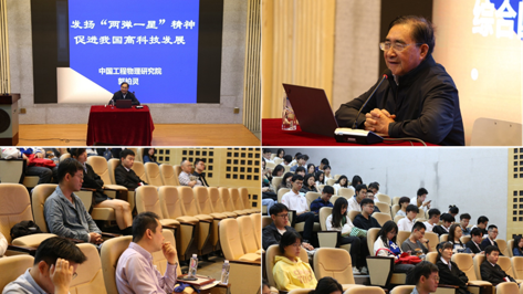报告中,郭院士以近代历史的冲突为切入点,强调了核武器的重要性,并带领大家回顾了我国“两弹一星”事业的发展史,介绍了我国核武器的研制背景、发展历程以及“两弹一星”事业取得重大突破的成功经验。“确定国家目标,聚集优秀人才”是郭院士报告中的第一个部分,他结合自身参与“两弹”事业的经历介绍了当年中国物质条件匮乏、高精尖人才短缺和技术落后的状况,向我们阐述了当年党中央调动人员的雷厉风行、九院科研人员克服重重困难的坚持不懈,以及人民群众为国奉献的政治觉悟。之后,郭院士用大量图片资料,向大家讲述了“两弹一星”功勋奖章获得者钱三强、郭永怀、朱光亚、周光召等老一辈科学家在艰苦条件下,不忘初心,无畏前行,为中国国家安全做出突出贡献的感人事例,深刻阐释了“热爱祖国,自立自强,团结协作,勇于攀登”的“两弹一星”精神。