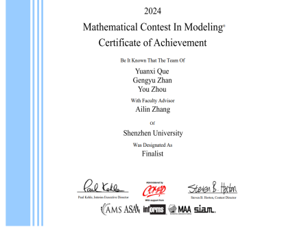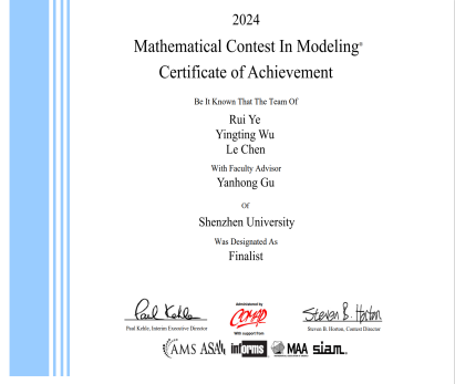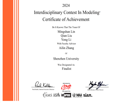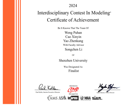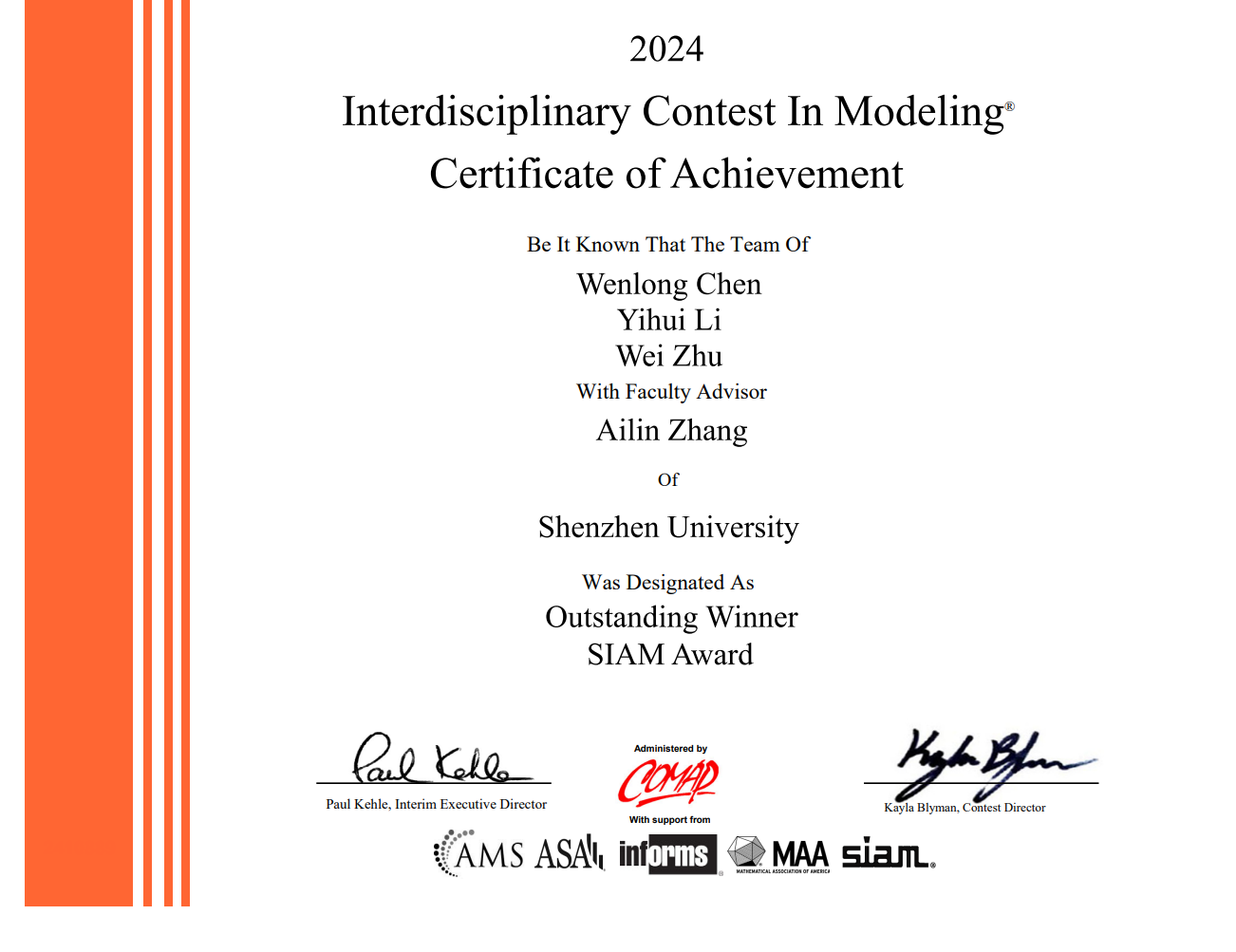 在2024年度美国大学生数学建模竞赛(MCM/ICM)中,深圳大学数学科学学院张爱林老师指导的参赛队伍从全球2.8万支大学生队伍中脱颖而出,不仅荣获了该竞赛的最高荣誉——Outstanding奖(简称O奖,获奖率为0.12%),还斩获了美国工业与应用数学学会(SIAM)颁发的SIAM冠名奖。此外由数学科学学院学科竞赛研究团队指导的其他参赛队伍还获得特等奖提名5项、一等奖6项、二等奖25项,与2023年的获奖情况(特等奖提名3项、一等奖9项、二等奖16项)相比有了非常明显的进步。