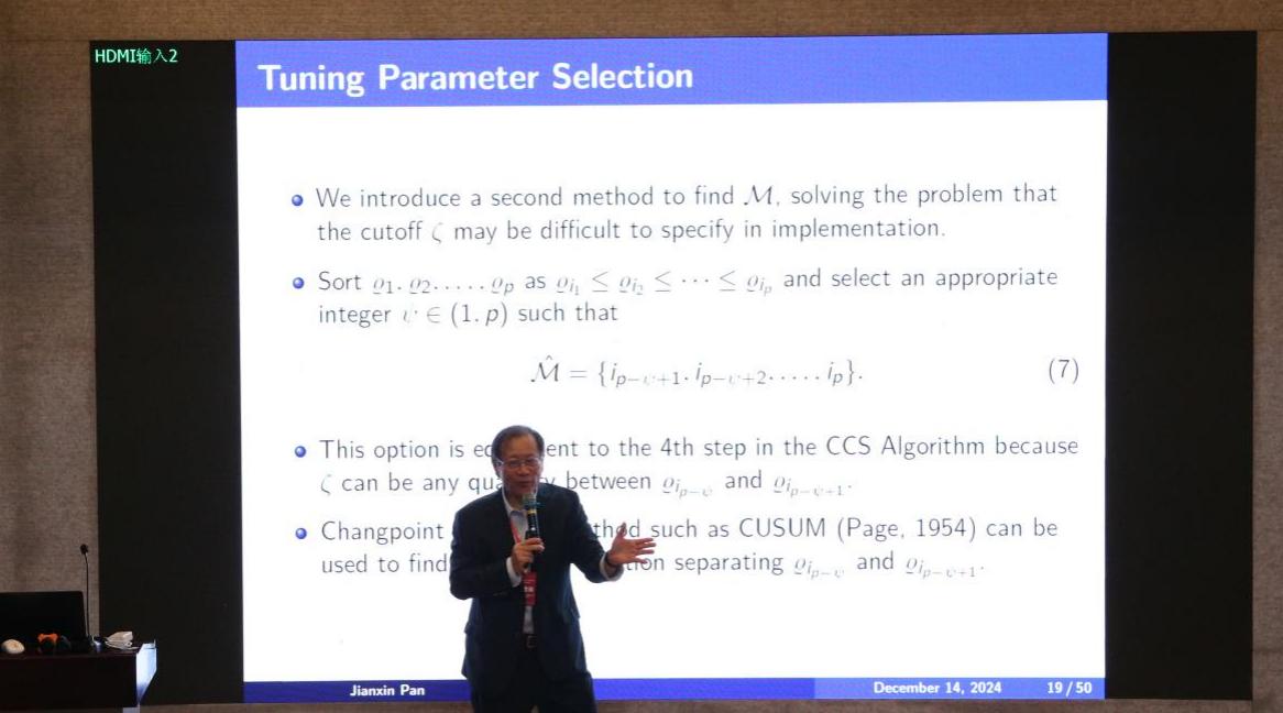 北师港浸大协理副校长(国际发展)兼理工科技学院院长、英国皇家统计学学会会士潘建新教授,发表了题为“Precision matrix regularization for ultra-high dimensional data”的学术汇报。 潘教授提出了一种在极小样本量下估计超大量变量的精度矩阵的方法。该方法首先通过协方差列筛选识别显著相关的子群,然后发展了一种块对角协方差结构的正则化方法,仅保留小子群内的协方差,大大提高了计算效率。该方法在几秒钟内就能为数千变量提供可靠的精度矩阵估计,而现有方法至少需要几个小时。