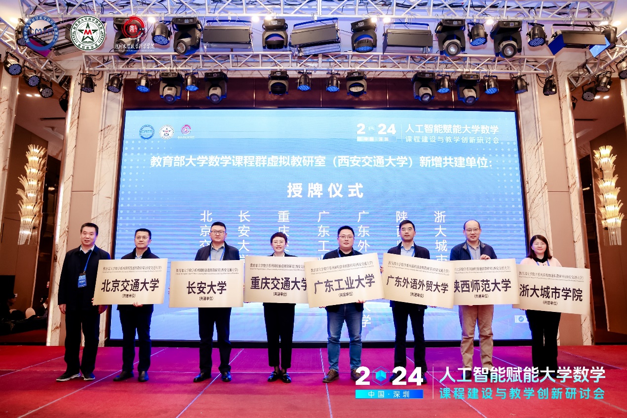12月14号上午会议开幕。深圳大学教务部李振华副主任首先发表了致辞,她强调了人工智能在大学数学教学中的重要性,并表示深圳大学教务部将全力支持这一领域的探索与实践。随后,教育部大学数学课程群虚拟教研室(西安交通大学)负责人李继成教授和教育部大学数学课程群虚拟教研室(国防科技大学)执行负责人王晓教授分别发表了讲话,分别介绍了虚拟教研室的建设情况,分享了各自对于人工智能与数学教学结合的见解,开幕式由深圳大学数学科学学院韩雨副院长主持。开幕式上还举行了教育部大学数学课程群虚拟教研室新增共建单位的授牌仪式,新增虚拟教研室共建单位的负责人(包括:北京交通大学空孔令臣教授、长安大学宋学力教授、重庆交通大学赵磊娜教授、广东工业大学何伟骅教授、广东外语外贸大学王军威教授、陕西师范大学周红军教授、浙大城市学院罗来珍教授)也分别发表了精彩的发言,他们纷纷表示未来将全力支持虚拟教研室的建设。这些新成员的加入,无疑将为虚拟教研室的发展注入新的活力。