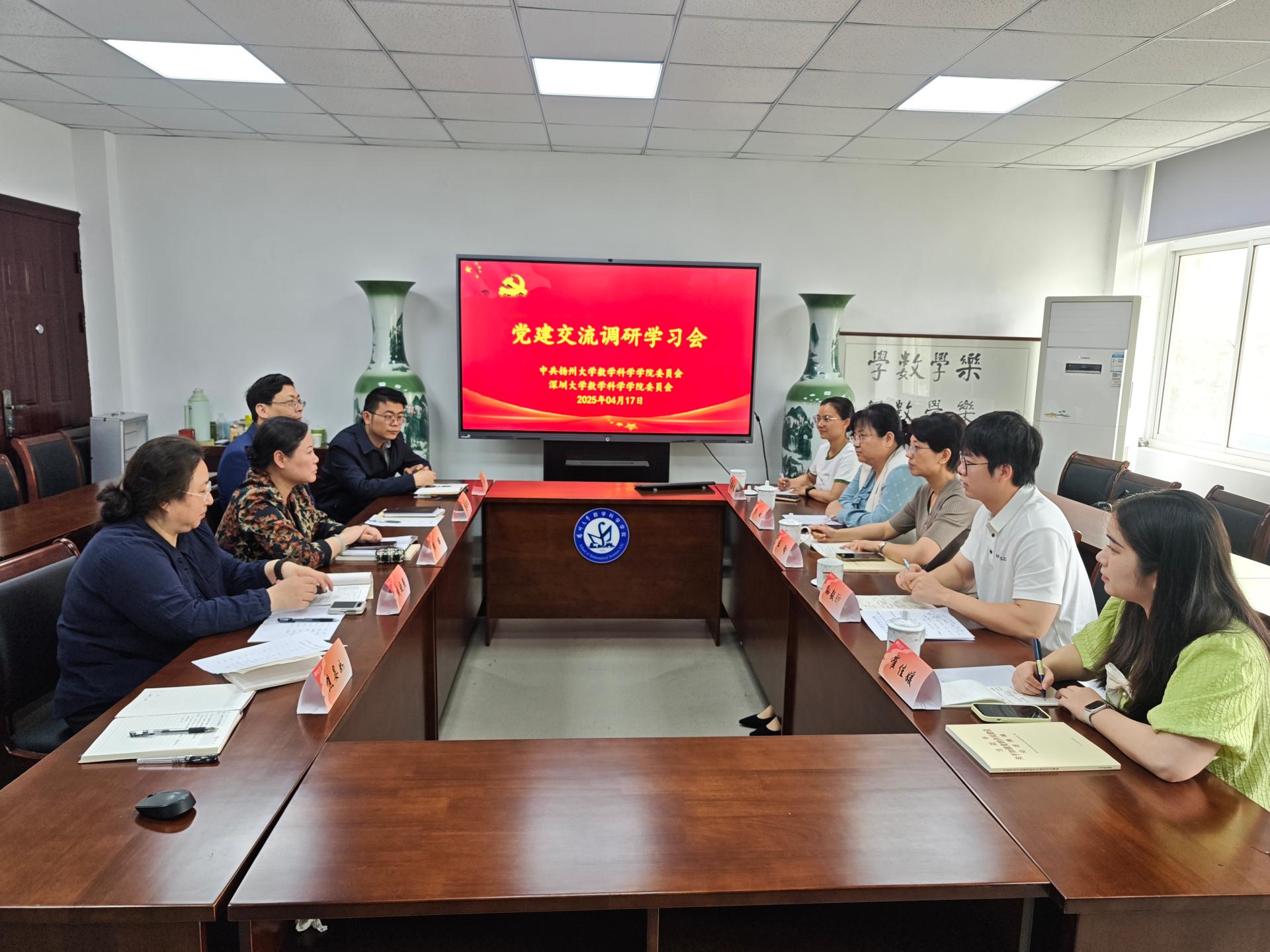 为深入贯彻新时代党的建设总要求,促进高校基层党建与学科发展深度融合,2025年4月17日,深圳大学数学科学学院党委书记王瑜率队赴扬州大学数学科学学院开展专题调研。双方围绕党建创新、人才培养、学生就业等核心议题展开深入交流。