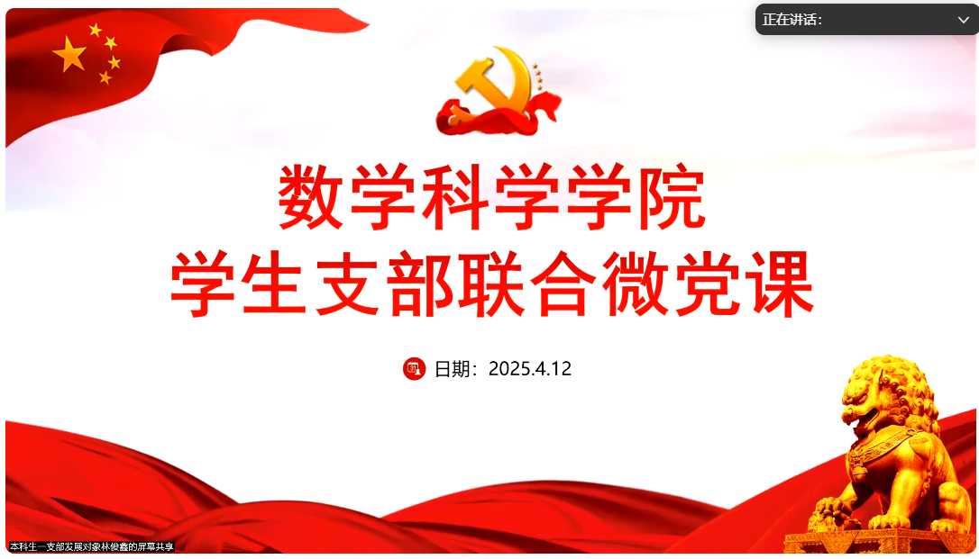 为开展深入贯彻中央八项规定精神学习教育,深化理论学习,强化党性修养,4月12日晚,在学院党委指导下,数学科学学院分党校组织四个学生党支部联合开展了2025年第一次集中微党课。此次微党课通过腾讯会议形式进行,由本科生第一党支部承办,唐晓和肖扬两位正式党员同志主讲,林俊鑫同志主持,学院本科生和研究生党员、发展对象、积极分子共243人参加。微党课围绕马克思主义唯物辩证法与作风建设主题展开,两位主讲人结合理论与实践,为与会同学带来深刻的思想启迪。