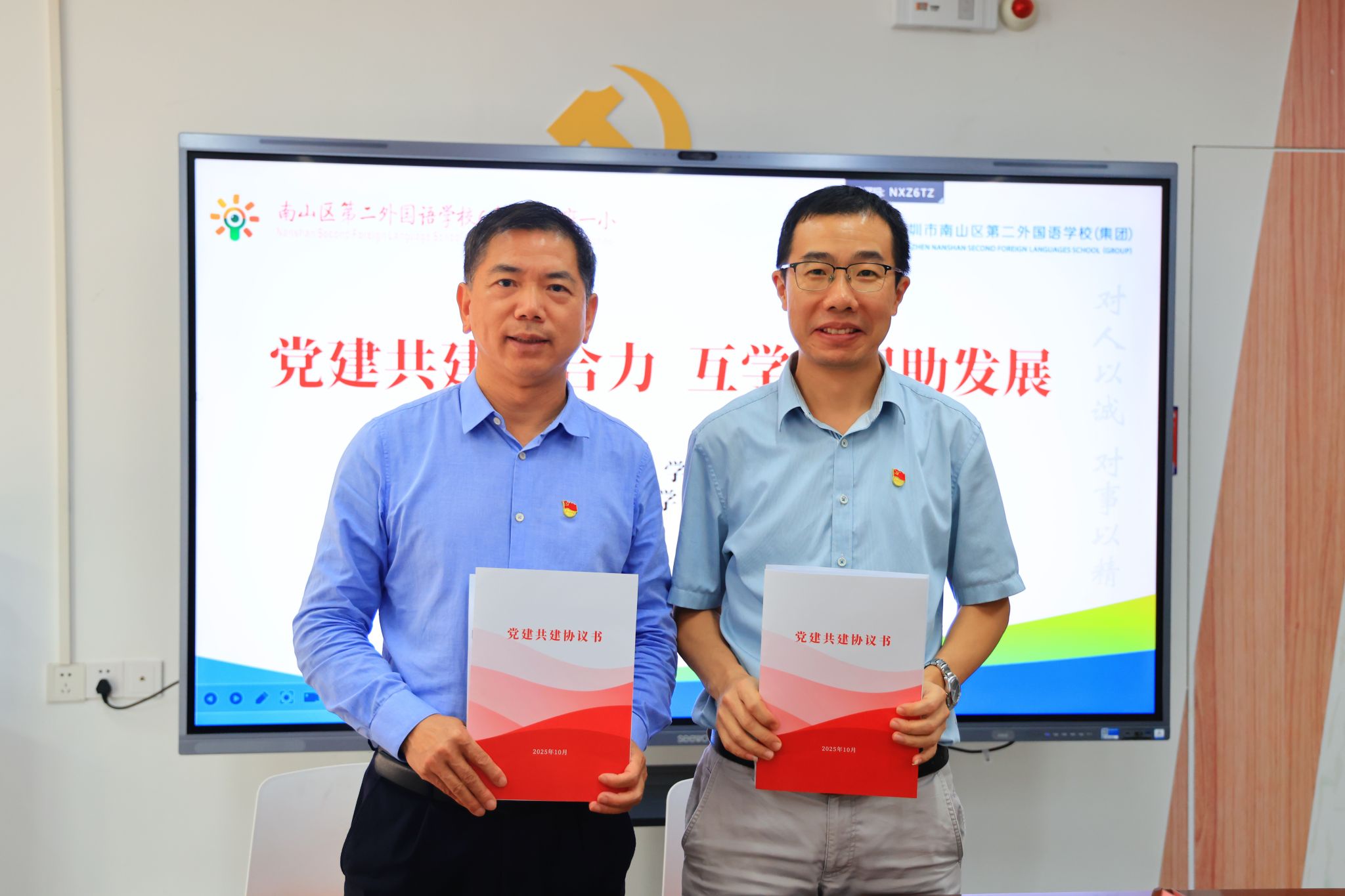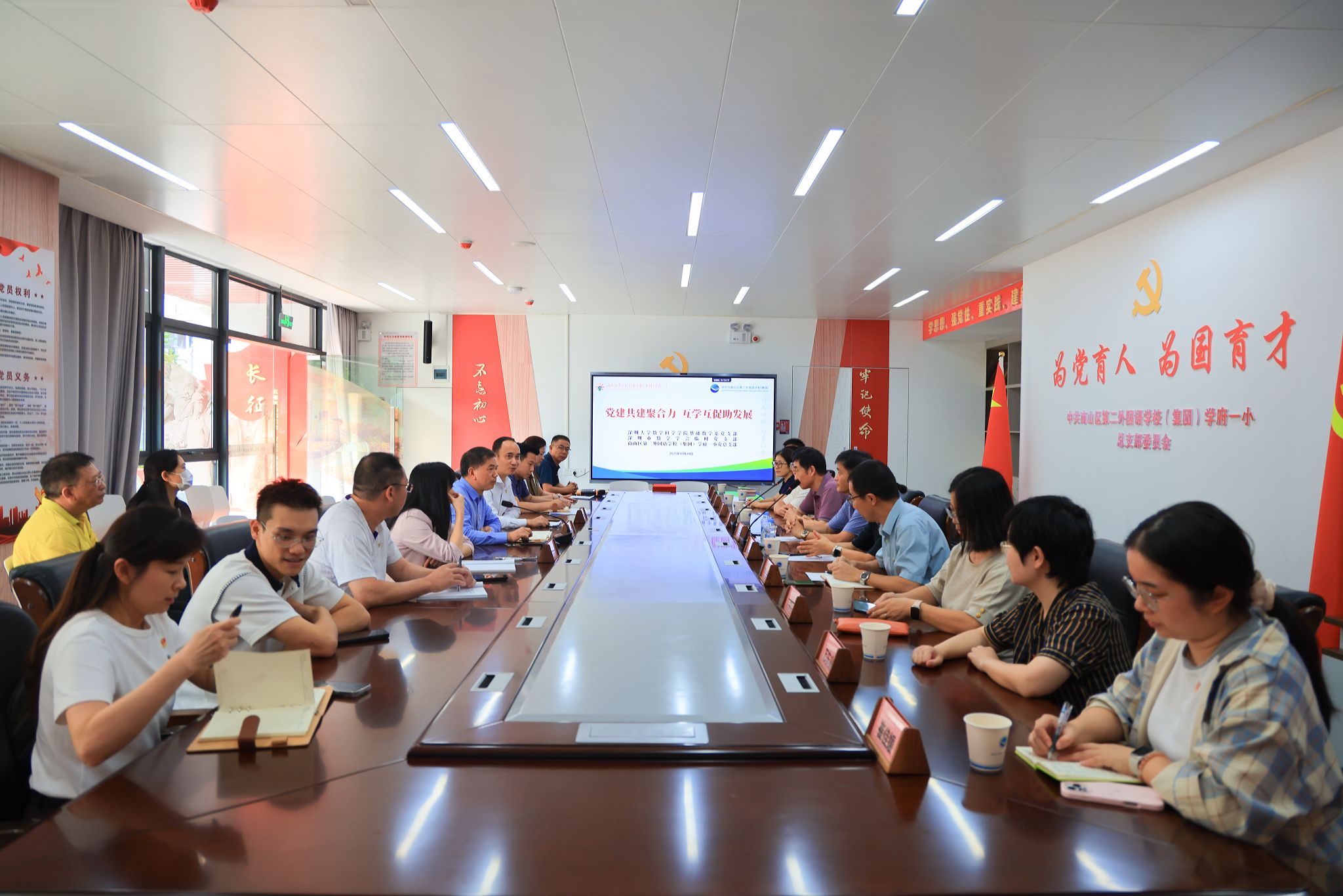 为深入推进大中小学一体化协同育人建设,加强基层党组织间的交流合作,2025年10月30日下午,深圳大学数学科学学院基础数学系党支部与南山区第二外国语学校(集团)学府一小党总支,在学府一小党建会议室举行党建共建签约仪式。基础数学系党支部书记李鹏及支部成员、学府一小党总支书记张永才、校长黄大耀、副校长彭苏丹及教师代表共同出席了本次活动。