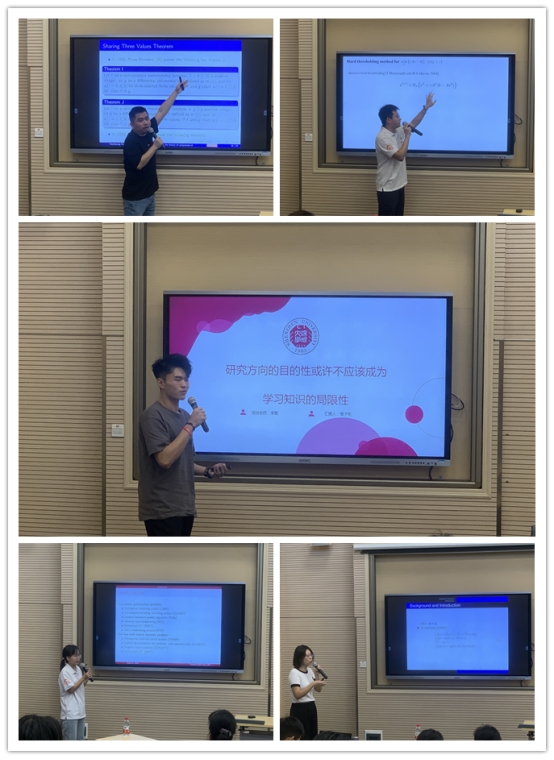 黄小皇同学汇报了Some problems in the theory of uniqueness of meromorphic function的研究、刘艳艳同学汇报了线性反问题中的非凸算法研究、杨澈洲同学汇报了Optimal group thresholding algorithms for group sparse optimization的研究、李晓同学汇报了三维各项MHD-Boussinesq方程组的定性研究、曾子铭同学汇报了研究方向的目的性或许不应该成为知识获取的局限性。